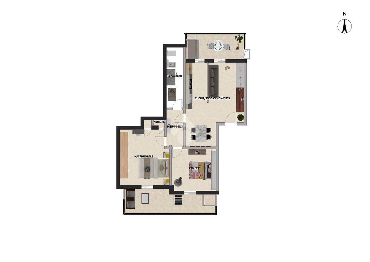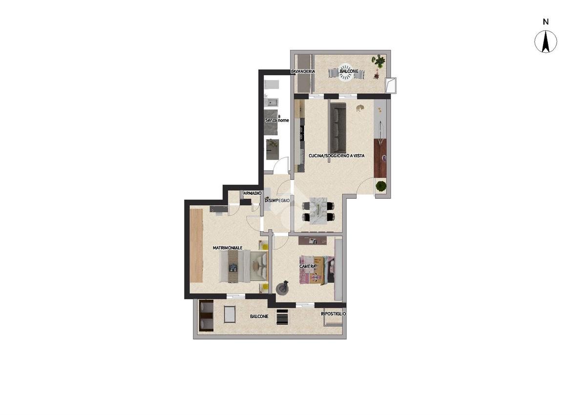 L'appartamento offre una doppia esposizione che garantisce ambienti luminosi ed arieggiati e comprende una spaziosa zona giorno divisa in zona relax, zona pranzo e angolo cottura, la parte notte e saparata da un utile disimpegno e dispone di due camere da letto, ed un bagno. Entrambe le zone si espongono su spaziosi balconi, perfetti per momenti di relax all'aperto, mentre una pratica lavanderia ed un ripostiglio esterni aggiungono funzionalità.