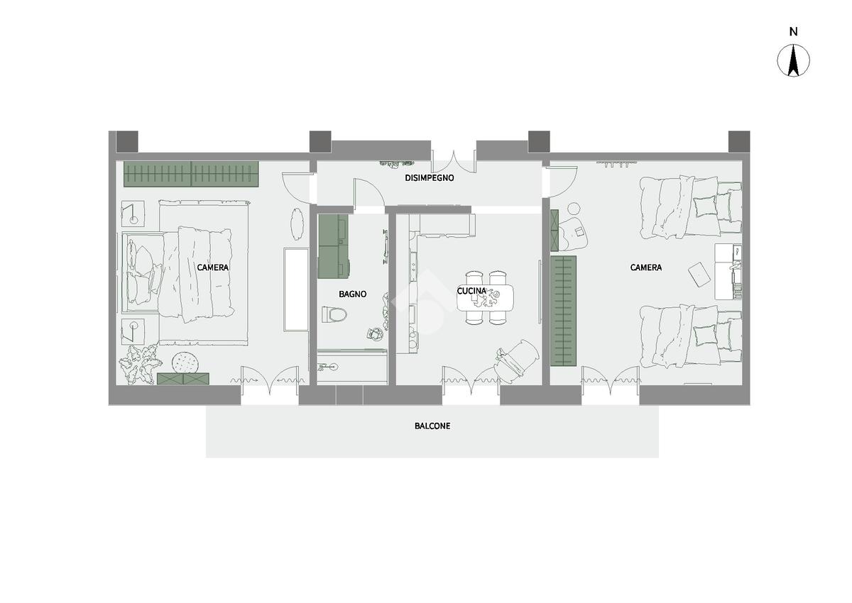 Questa soluzione abitativa offre un ambiente accogliente e funzionale cosi distribuito: cucina abitabile con fracassè, spaziosa cameretta, camera matrimoniale e bagno con box doccia, tutte le stanze si affacciano su un unico balcone che rende luminosi tutti gli ambienti.